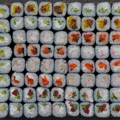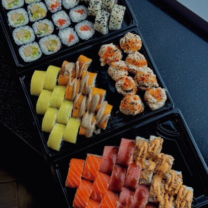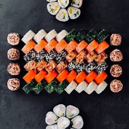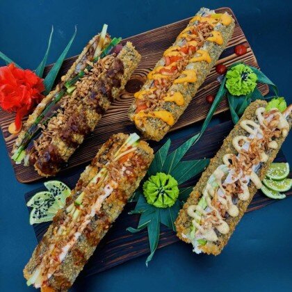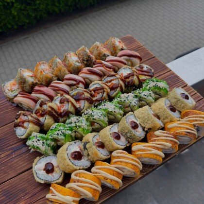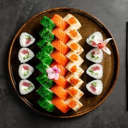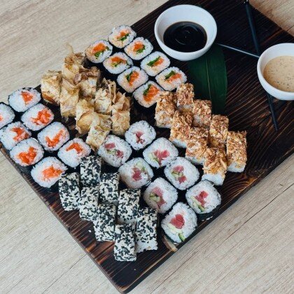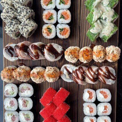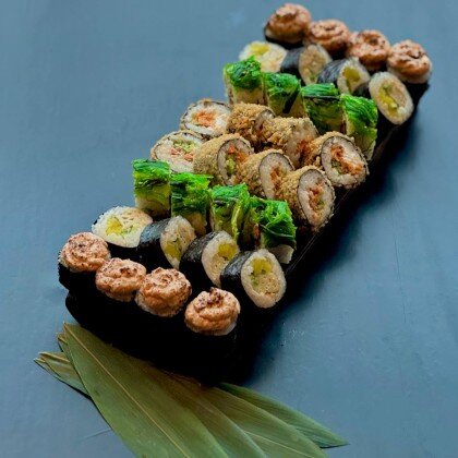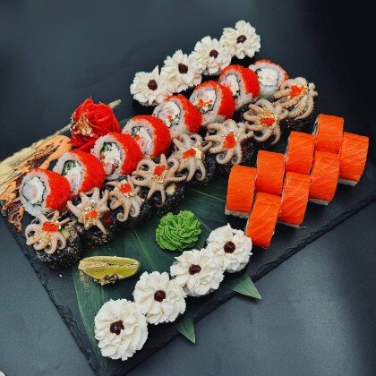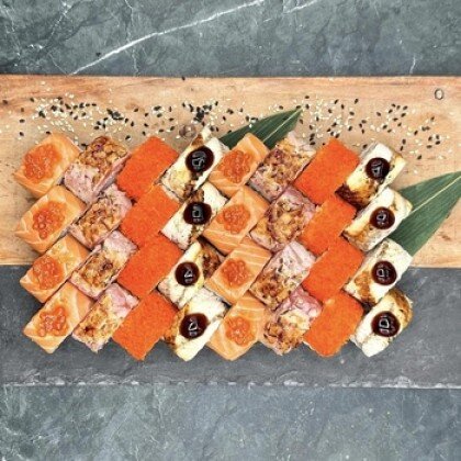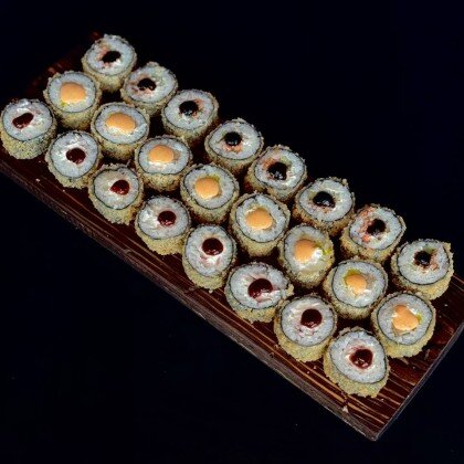 ролл «Мидия такуан» (мидия в устричном соусе, такуан, сыр сливочный, кунжут),
