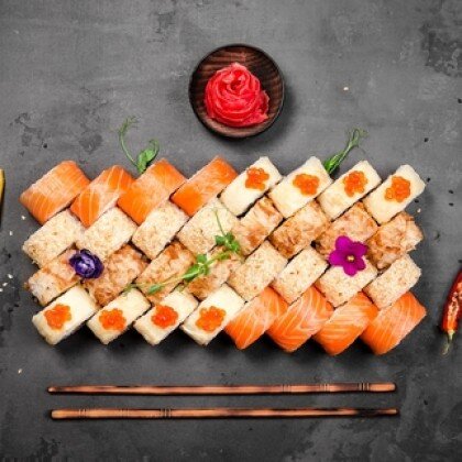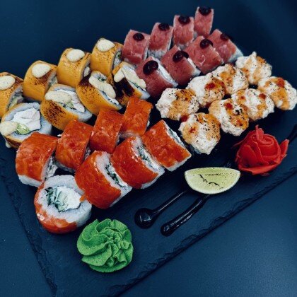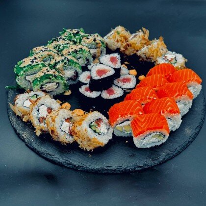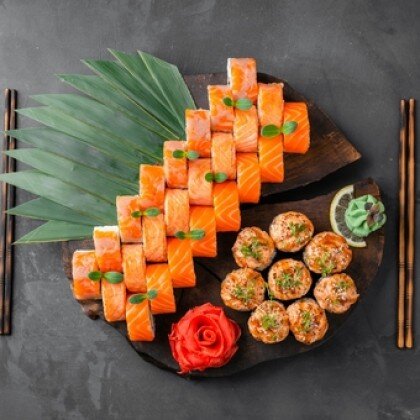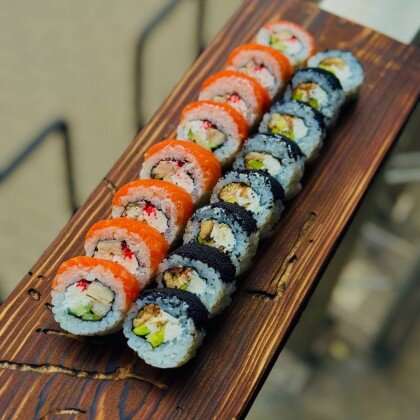 ролл «Опаленный микс» (с лососем и сливочным сыром на ролле с огурчиком),
