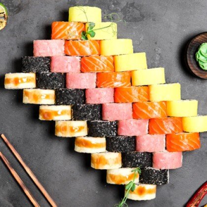 Ролл «Карамельная филадельфия» (лосось, огурец, сахар тростниковый, сыр сливочный),