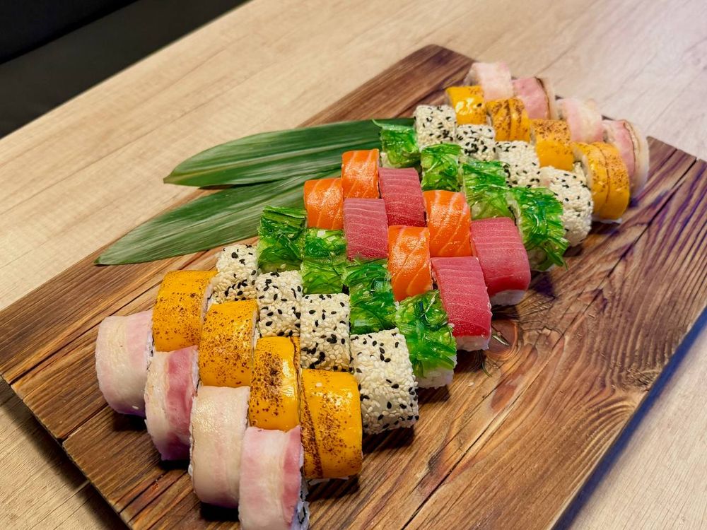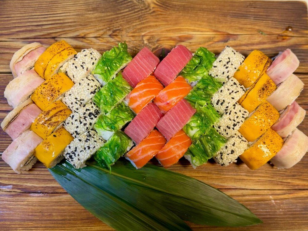 Салат чука,сыр сливочный,нори,Жаренный лосось в соусе терияки,такуан