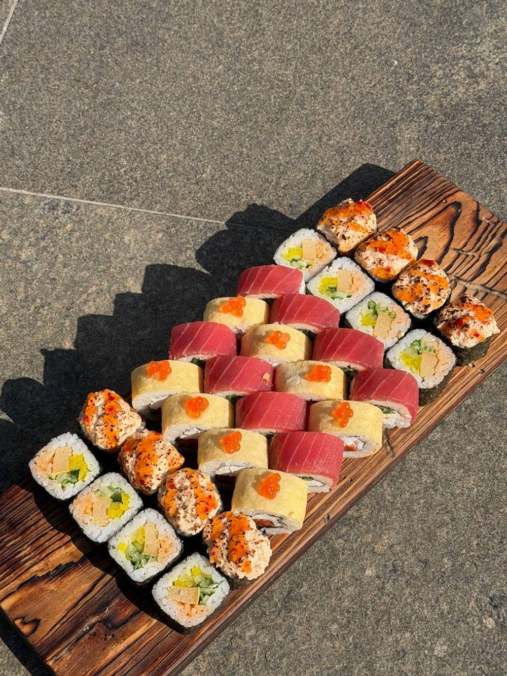 3) томаго маки: рис, нори, соус спайси, томаго омлет, огурец, такуан;