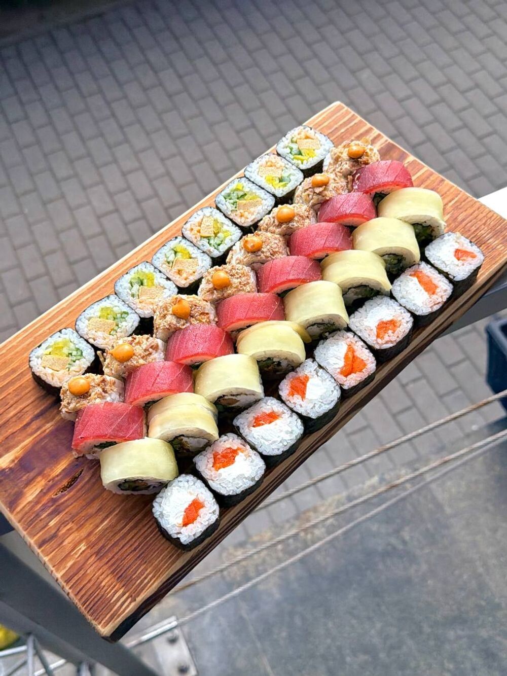 1) Филадельфия тунец: рис, нори, сыр сливочный, огурец, тунец;