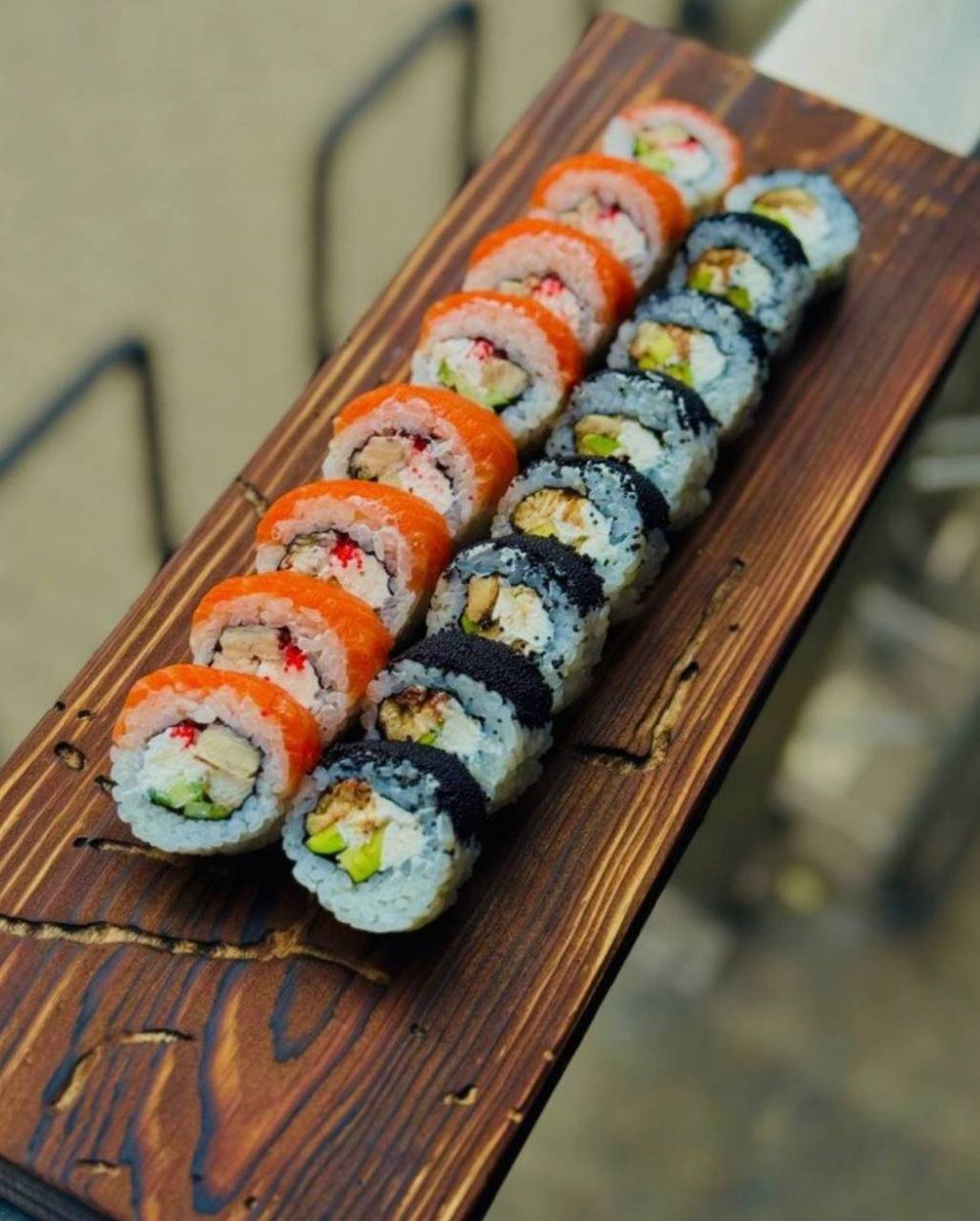 Ролл филадельфия с угрем рис , сыр сливочный, икра тобико красная, угорь, огурец лосось Ролл блэк угорь рис, сыр сливочный, угорь, авокадо, икоа тобико черная