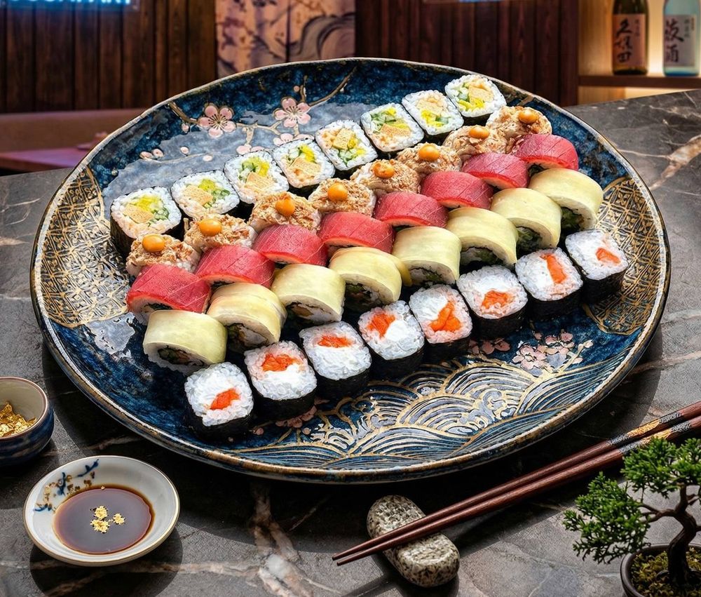 3) ролл мидии в такуане: рис, нори, сыр сливочный, мидии, огурец, такуан;
