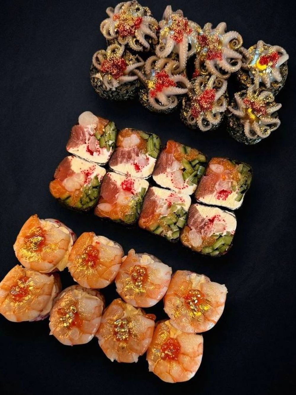 Невероятный баланс морских обитателей, свежайший лосось, королевская креветка, неповторимый тунец, в сочетании со сливочным сыром, икрой тобико и хрустящим свежим огурцом, создают феерию неповторимого вкуса.